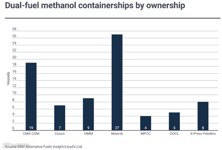 目前,在抢夺新造船档期以及采购甲醇燃料的竞争中,马士基均处于明显的领先地位。马士基的最新造船订单使其甲醇燃料集装箱船订单达到27艘。其第一艘甲醇双燃料集装箱船,即2,100TEU的“Laura Maersk”轮将于6月从韩国现代尾浦造船交付,并将成为全球首艘投入运营的甲醇燃料集装箱船。