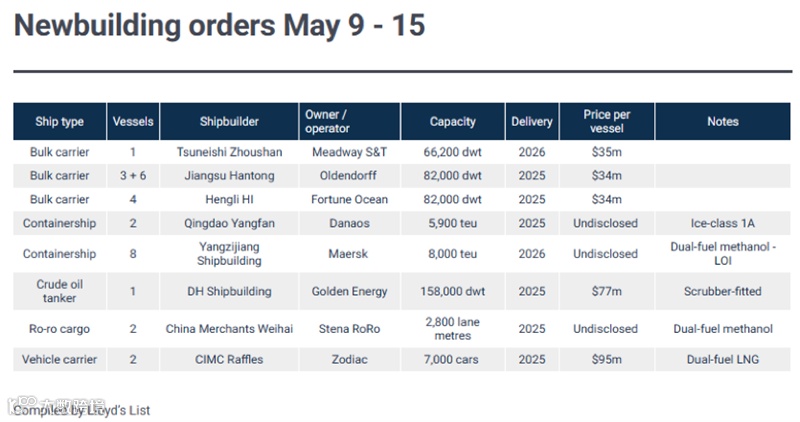 除了马士基的意向书之外,上周还有8艘散货船、2艘集装箱船、1艘油轮、2艘滚装船和2艘汽车船(PCTC)的新造船合同得到确认。
