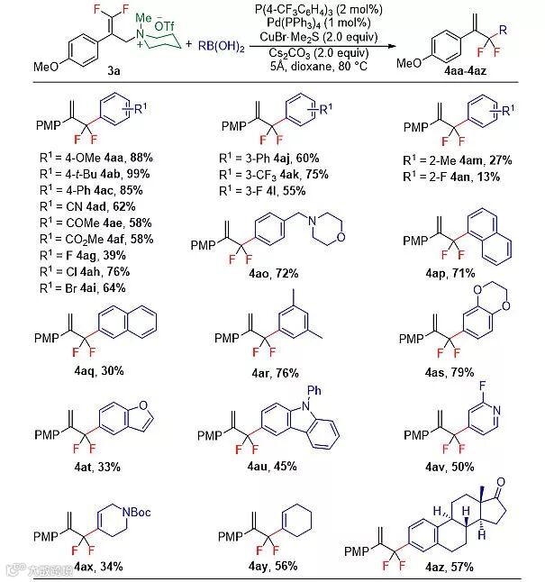在确定最优条件后,作者对三氟甲基烯基类底物进行拓展,含有中性基团及给电子基团的三氟甲基烯基类化合物普遍适用该反应,并且都可以得到较高的产率(图2)。此外,作者对硼酸的适用范围进行探究,发现电子效应对该反应影响较小,都可以以较优的产率得到目标产物,空间效应较为明显,当硼酸邻位含有取代基时,产率较低。此外,烯基硼酸和杂环硼酸也可以得到目标产物(图3)。