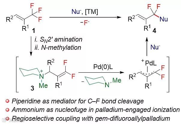 近日,南京工业大学的冯超教授课题组报道了三氟甲基烯基类化合物C-F键选择性芳基化构建偕二氟甲基化合物。此策略以廉价易得的三氟甲基烯基类化合物为底物,通过SN2反应,首先与哌啶反应制得氨基化产物,然后再甲基化制得季铵盐产物,最后季铵盐化合物与硼酸在钯催化下发生偶联,得到偕二氟甲基化合物(图1)。