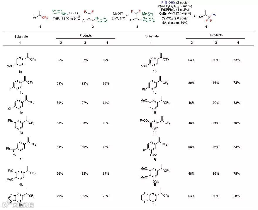 综上,冯超教授课题组发展了一种使三氟甲基烯基化合物C-F键选择性芳基化和烯基化的新方法。该方法以三氟甲基烯基化合物为底物,通过SN2反应,实现氨基化、N-甲基化和钯催化芳基化,最终合成了偕二氟甲基化合物。此外,胺化和芳基取代过程的高区域选择性被认为是这种转化成功的原因。由于其底物范围广、实用性强,有望在新药先导化合物的发现中得到更多的应用。