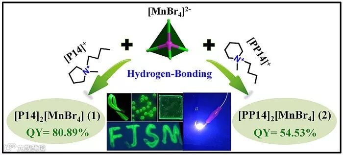 基于此背景,中国科学院福建物质结构研究所黄小荥课题组和福建师范大学杜克钊课题组,利用有机分子相近的[P14]Br和[PP14]Br离子液体分别合成了两例Mn(II)基晶体材料:[P14]2[MnBr4]和[PP14]2[MnBr4]。两例化合物的晶体结构类似,且都具有绿色发光性能,但是发光量子产率却相差甚大,其中[P14]2[MnBr4]的发光量子产率为81%,而[PP14]2[MnBr4]的只有55%。通过Hirshfeld表面计算,他们发现[P14]2[MnBr4]中[MnBr4]2-单元与有机阳离子[P14]+的相互作用远强于[PP14]2[MnBr4]中无机阴离子与有机阳离子的相互作用,较强的相互作用增加了[P14]2[MnBr4]结构的刚性;单晶衍射结构分析也表明[P14]2[MnBr4]比[PP14]2[MnBr4]的晶体结构更为有序。刚性而有序的晶体结构减少了[MnBr4]2-单元的热振动,抑制了其非辐射转移,从而导致[P14]2[MnBr4]具有较高的量子产率数值。