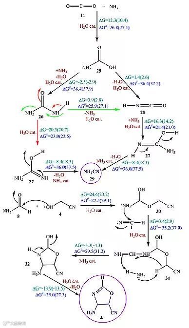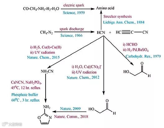 上图所示的2-氨基恶唑则是RNA合成的重要前体,其他的小分子则为氨基酸、糖类等生命所需基本物质提供前体化合物。这样的推演下,致死的毒物产生原始的生命,看起来也不无道理。