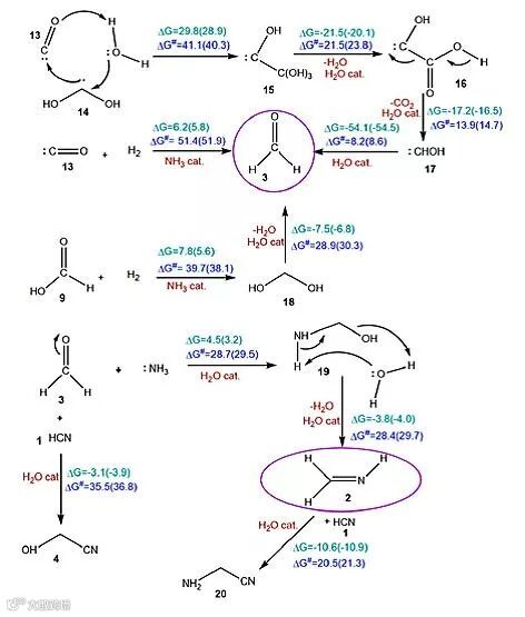 生成基本有机化合物单元(如CO、CO2、HCHO、HCOOH等)具体的反应过程可以看下面这张长图,详述了反应过程的电子转移、能量变化以及涉及到的各中间体。