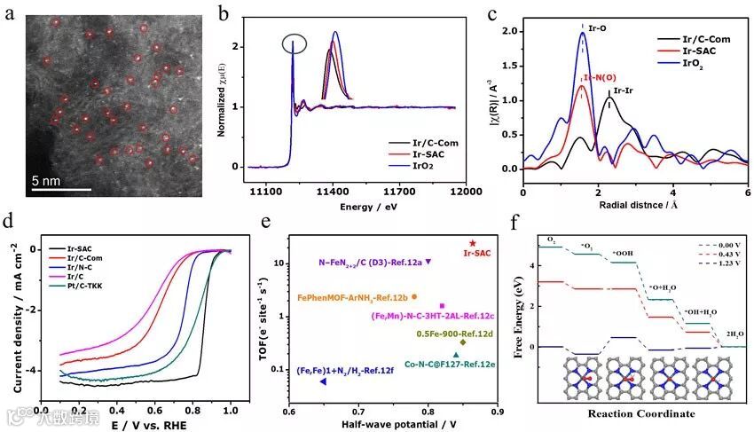 近日,加拿大滑铁卢大学陈忠伟院士课题组联合温州大学王舜教授课题组与美国布鲁克海文国家实验室苏东博士课题组、美国阿贡国家实验室吴天品博士课题组合作,基于理论计算指导,设计并制备了一种均匀分散的单原子Ir-N-C(Ir-SAC)高效氧还原催化剂。高角环形暗场扫描隧道显微镜HAADF-STEM结合X射线吸收精细结构谱(XAFS)表征证实了Ir的单原子分散,与四个N原子及1个O原子结合配位形成稳定的Ir-N4-O结构。电化学测试表明,该催化剂在酸性条件下表现出十分优异的催化活性和稳定性,其半波电位高达0.864 V,循环5000圈后性能几乎无衰减。进一步分析表明,该催化剂拥有超高的质量活性(12.2 A mg-1Ir)以及转化频率(TOF: 24.3 e- site-1 s-1),远高于文献报道的其他单原子催化剂以及商业Pt/C催化剂。值得注意的是,商业Ir/C-Com(Ir纳米粒子)和自制Ir/C(单原子Ir和Ir团簇并存)表现出可忽略的ORR活性,推测出Ir的配位环境决定了其催化剂性能。这一推论也被密度泛函理论计算(DFT)得到验证。DFT计算结果表明Ir-N4的特定结构修饰了Ir的电子结构,使得ORR中间物种在Ir的吸附能适中,从而使其具有最优的催化性能。