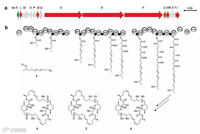 经过一番网络验证和调试。TransATor大显身手的机会到了。他们选择一株来自海洋苔草植物根际的细菌Gynuella sunhinyii YC6258(内含未鉴定的trans-AT PKSs基因簇),利用TransATor分析其中一个trans-AT PKSs,发现此类系列有极高可能产生具有抗菌活性的tartrolon类聚酮化合物。为了验证所预测的结构,他们对Gynuella sunhinyii YC6258进行培养发酵,分离纯化,最后分离鉴定出3个tartrolon类化合物,其中1个与预测结构完全吻合,另外两个高度相似(图3)。
