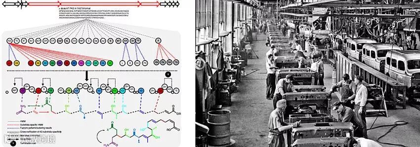 图2. TransATor预测trans-AT PKSs产物化学结构的工作流程(左),工厂生产装配线(右)。图片来源:左图来自Nat. Chem. Biol.,右图来自网络