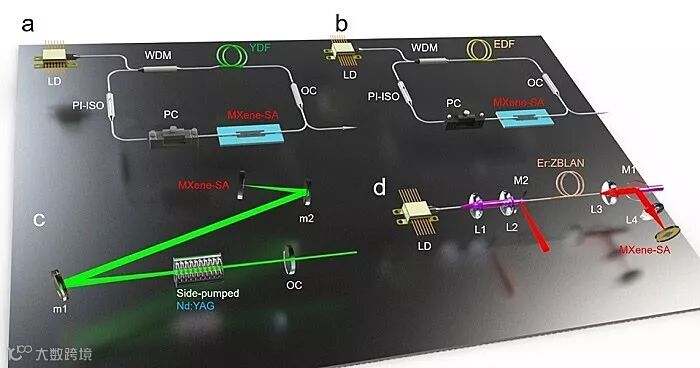图3. 激光谐振器的示意图。(a-b)分别内置喷墨打印MXene的D型光纤可饱和吸收体的掺铒和掺镱光纤激光器;(c-d)分别内置喷墨打印MXene的可饱和金镜的侧泵Nd-YAG激光器和LD泵浦的掺铒ZBLAN MIR光纤激光器。