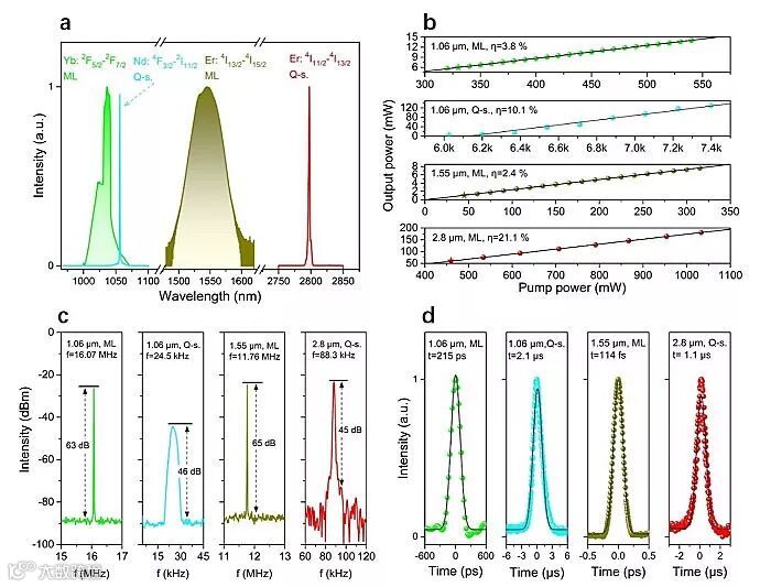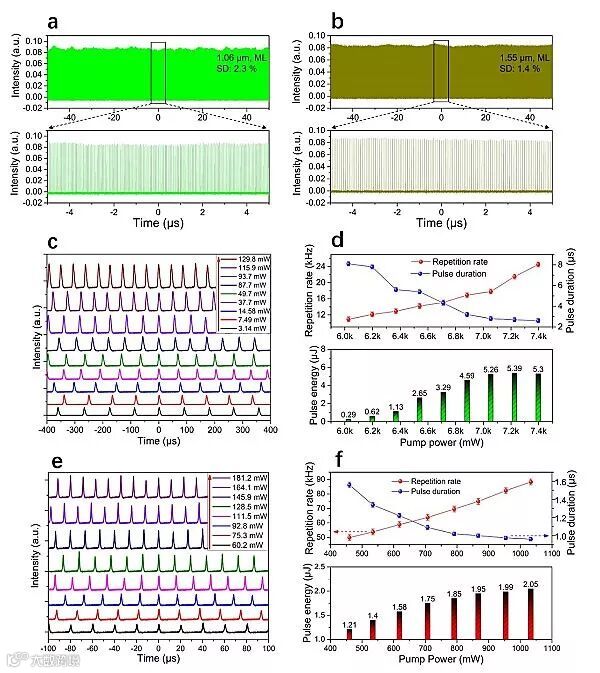 图4. 宽带脉冲激光器实验效果。(a-b)分别是1.06 μm和1.55 μm光纤激光器的锁模脉冲序列图谱;(c,e)分别是1.06 μm和2.8 μm的调Q激光器的脉冲序列在不同功率下的变化情况;(d,f)分别是1.06 μm和2.8 μm的调Q激光器的重频,脉宽及输出功率之间的关系。