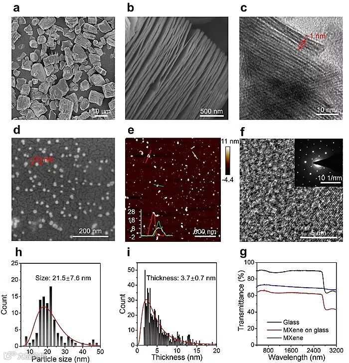 图1 . MXene的形态特征。(a-b)不同倍率下的MXene粉末的SEM图像;(c)HRTEM图像显示了MXene的中间层厚度;(d-e)IPA油墨前体中的MXene纳米片的SEM和AFM图像;(f)MXene纳米片的HRTEM图像;(h-i)通过SEM和AFM分别表征纳米片的大小和厚度分布;(g)沉积在石英玻璃基板上的MXene纳米片的光学透射率。