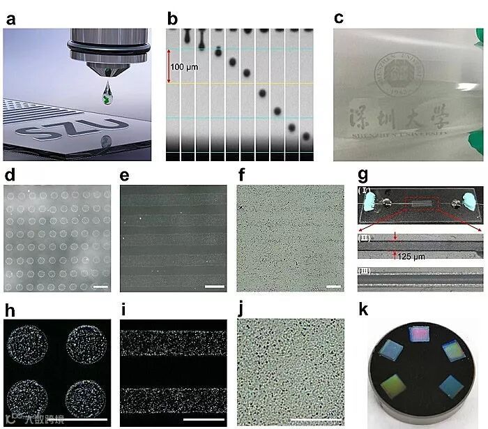 图2. 喷墨打印特征。(a)喷墨打印原理图;(b)打印从打印机频闪摄像机观察到的液滴序列;(c)深圳大学喷墨印刷标识透明柔韧的PET薄膜;(d-f,h-j)玻璃基板上的印刷点,条纹和平面,比例尺:100 μm;(g)打印的侧抛光纤维可饱和吸收体;(k)打印具有不同的印刷层的可饱和吸收镜(SAM),顺时针印刷的层:10L,20L,16L,8L,4L。