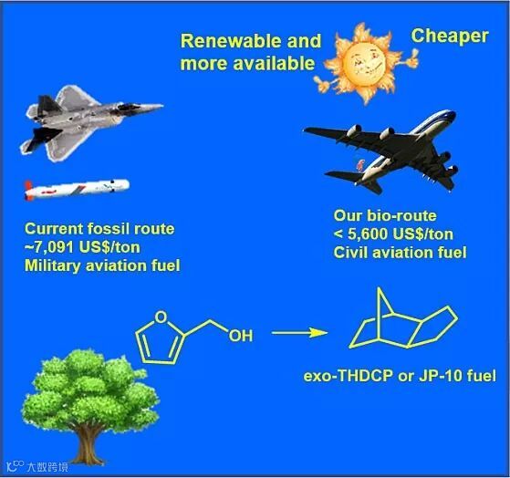 该路线需要经过水相重排、加氢、脱水、异构化等反应,将糠醇转化为JP-10。所有反应中均采用简单易得的多相催化剂,催化剂易于制备和回收再利用。经过计算,通过生物质路线,由糠醇获取JP-10燃料的成本可以降低到每吨5600美元,略低于目前由化石能源获得的JP-10燃料的价格(约7091美元/吨)。此外,根据文献报道,未来糠醇的价格有望从目前1500美元/吨降至400美元/吨,届时JP-10燃料的成本将可降低至每吨2900美元以下,进而有望实现生物质JP-10燃料在民航中的实际应用。