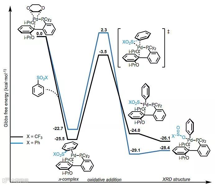作者还用DFT计算进一步探讨了反应机理,补充了实验结果。由于上述实验支持氧化加成是循环决速步,在与具有挑战性亲电试剂的SMC反应中,第一步是配位溶剂分子(二氧六环)与底物的配体交换,形成π-配合物,对PhSO2CF3稍微有利(图7)。C-S键氧化加成的过渡态的Gibbs自由能,PhSO2Ph比PhSO2CF3的活化能高5.8 kcal/mol,与整个催化反应的实验趋势一致,与后续C-S键极性的增加相一致。S-键合的Pd中间体在能量上接近观察到的O-结合XRD结构X1。