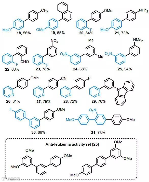 然后,作者利用优化的条件考察了各种芳基三氟甲基砜和芳基硼酸(图4)。在硼酸或砜上,给电子或吸电子基都能兼容。在含有硝基的底物(3,11,23-25,31)中会选择性在砜上发生偶联,这为利用最近发现的硝基SMC反应进行连续交叉偶联提供了可能性。大位阻硼酸也能以优异的产率(8-10,17,21和29)发生交叉偶联。噻吩硼酸也有良好的耐受性(6和13),而吡啶硼酸没有反应。2-氟芳基取代基对砜底物反应性没有影响(20,22,23)。2-吡啶砜(26-29)和间位、对位取代联苯基砜的交叉偶联产率良好,顺利得到30和31,后两种化合物是抗白血病化合物类似物。底物范围的主要局限性在于含醛基的硼酸,在某些情况下(7,12和22)交叉偶联产率较低。