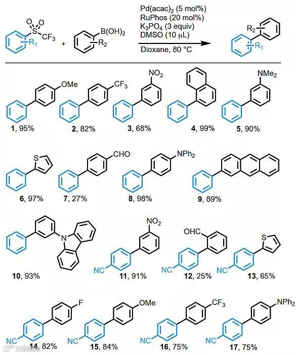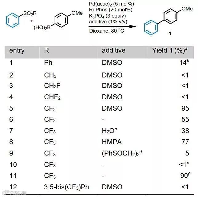 作者的初步实验侧重于确定能够用作亲电偶联配偶体的芳基砜(图2)。RuPhos作配体,在K3PO4、催化量Pd(acac)2和少量DMSO存在下时,二苯砜与4-甲氧基苯硼酸在130 °C(entry 1)发生偶联。苯基甲基砜及其单氟和二氟化类似物不反应,但苯基三氟甲基砜即使在80 °C时也能顺利发生偶联。DMSO作为添加剂可能是高收率的重要因素,能够增溶无机碱的其他添加剂也有类似的作用,但效果较小,而水则不利于反应。在这些条件下,三氟甲基亚砜或三氟甲基酮,没有发生偶联反应。