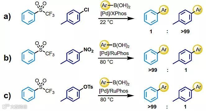 将芳基砜与其他亲电试剂进行比较的竞争实验表明,在标准条件下,芳基砜SMC 的反应活性至少比芳基氯代物慢两个数量级,但至少比硝基芳烃和芳基对甲苯磺酸酯快两个数量级。使用 Xphos 作为配体代替 RuPhos,在 80 °C下并不能实现砜的交叉偶联。