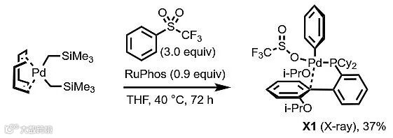 为了了解反应机理,作者进行了Pd(0)前体(1,5-环辛二烯)双(三甲基硅烷基甲基)钯和PhSO2CF3之间的当量反应,制得并分离出了反应中间体X1(图6)。X1的X-射线晶体结构表明,在氧化加成后,钯与亚磺酸盐的氧结合,表明钯配合物在对C-S键氧化加成后会发生重排。这种结构与卤代芳烃和硝基芳烃的氧化加成结构相似,钯以平面正方形的几何形式存在。X1与4-甲氧基苯硼酸在25 °C标准条件下的当量反应,以接近定量的产率得到了联芳基化合物1,表明氧化加成是催化循环中的决速步骤。在非标准条件下,使用X1(5 mol%)将4-甲氧基苯硼酸和PhSO2CF3偶联,以62%的产率得到1,而过量Ruphos(20 mol%)的存在将产率提高到95%,这表明过量的Ruphos延迟催化剂分解的能力有利于反应产率。为了跟踪离去基团,作者用D2O萃取粗反应混合物,用19F NMR检测到了三氟甲磺酸酯的存在。