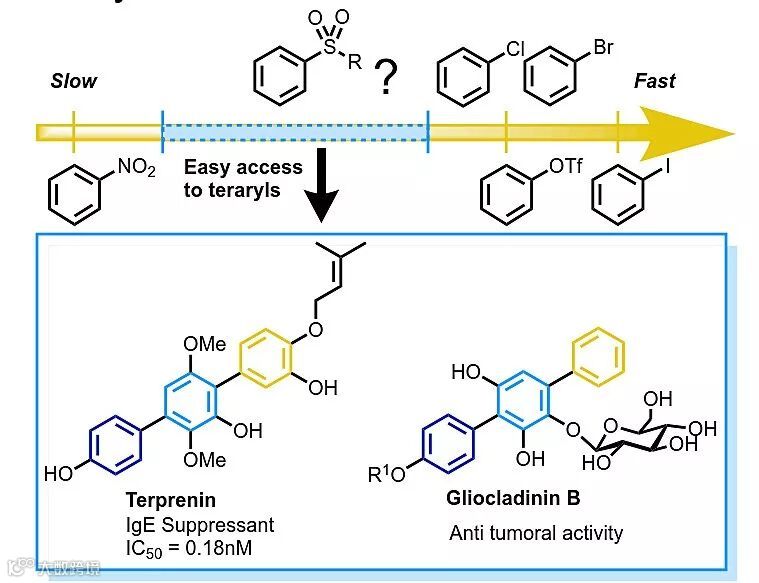 Joseph Moran教授课题组报道了(杂)芳基砜的Suzuki-Miyaura交叉偶联反应,涉及钯对芳基砜C-S键的一种相对罕见的氧化加成。值得注意的是,芳基三氟甲基砜反应活性介于硝基芳烃和卤代芳烃之间,通过连续交叉偶联可以仅用2到3步就顺利合成非对称的三联和四联苯基化合物。