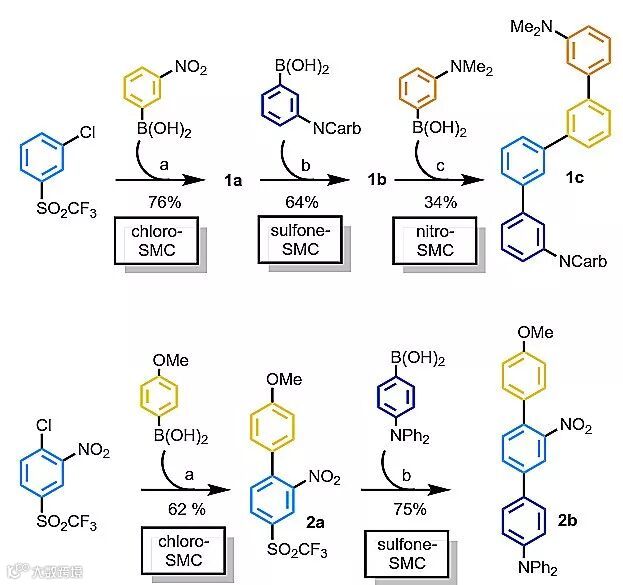 氯代芳烃(22 °C,以XPhos为配体)、芳基砜(80 °C,RuPhos为配体)和硝基芳烃(130 °C,以BrettPhos为配体)交叉偶联的反应条件相差甚远,基于此,作者开发了一种合成非对称三联和四联苯的连续SMC方法。2-氯苯基砜的氯与3-硝基苯硼酸发生SMC(chloro-SMC),生成联苯1a;接着是1a的砜基与4-N-咔唑基苯硼酸发生SMC(sulfone-SMC),得到三联苯1b;最后是1b硝基的SMC(nitro-SMC),产生四联苯1c。在同一芳环上还可以区分氯、砜和硝基等离去基,如1-氯-2-硝基-4(三氟甲基)砜基苯的氯选择性SMC得到联苯2a,其次才是砜选择性SMC得到2b。化合物30和31也能以类似的方式制备得到。