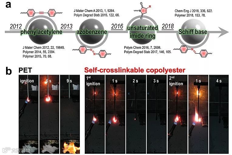 图1. 高温自交联炭化阻燃PET的发展历程(a);典型的自交联阻燃抗熔滴共聚酯与PET的垂直燃烧对比图(b)