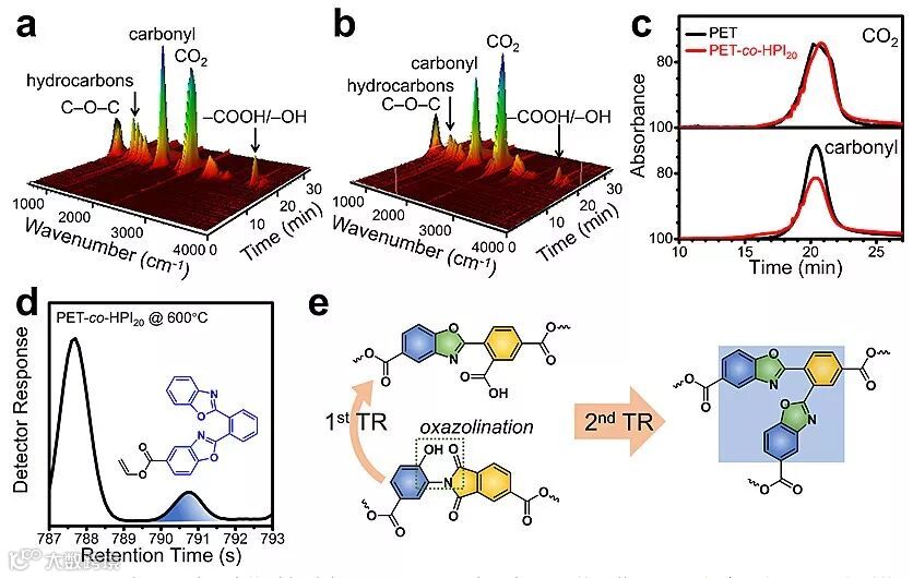 图4. PET和含HPI共聚酯的裂解过程:PET(a)和共聚酯(b)的三维TG-IR光谱;从TG-IR得到的CO2和羰基的吸光度强度随时间的变化;裂解色谱质谱联用中双苯并噁唑衍生物的色谱特征峰(d)和两步重排反应生成双苯并噁唑衍生物的过程(e)。