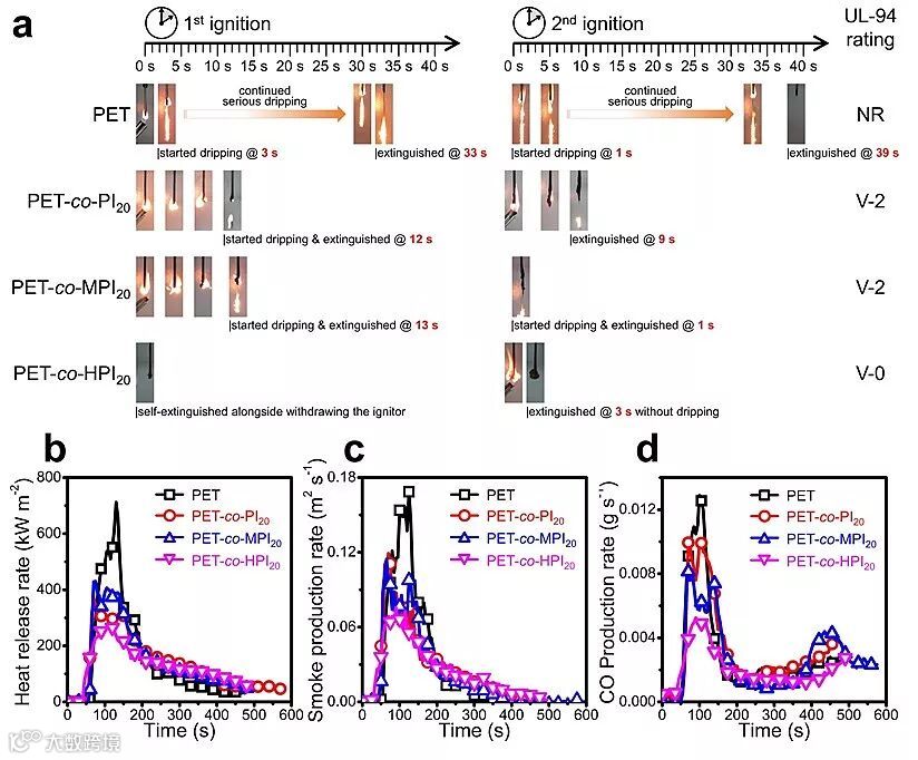 研究表明,含可高温重排HPI结构的PET共聚酯在垂直燃烧测试中表现出优异的阻燃抗熔滴性,在20 mol%单体共聚含量下,共聚酯一次点火过后离火即熄,二次点火过后3 s即发生自熄,可通过UL-94垂直燃烧V-0等级;而含MPI和PI结构的PET共聚酯则表现一般(图3a);HPI共聚酯也表现出优异的抑制热释放的效果,其锥形量热测试中的峰值热释放速率和烟生成速率较纯PET分别降低了62%和59%(图3b和c);而火灾中最致命的毒气CO的峰值释放速率也较纯PET降低了75%(图3d)。
