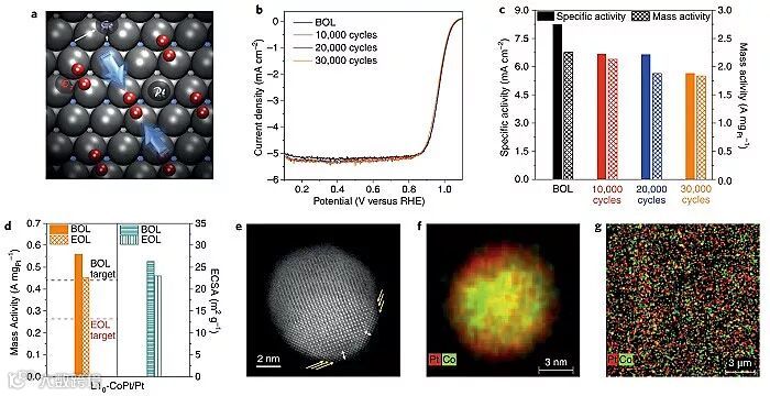 近年来,对金属间化合物催化剂的研究不断深入,也通过不同方式获得了具有特殊形貌结构的催化剂。其中,具有核-壳结构的有序L10-CoPt/Pt催化剂,在半电池(三电极体系,0.1M HClO4)测试中半波电位达到0.96 V(相对于可逆氢电极),其质量比活性为2.26 A/mgPt。在60 ºC电解液中经过30000次电位循环(0.6-1.0 V)后,其半波电位只下降7 mV,质量比活性仍保持为1.83 A/mgPt(图2)。值得注意的是,这一催化剂在实际质子交换膜燃料电池中也表现出非常好的性能,在80 ℃的燃料电池操作条件下,0.9 V时质量比活性为0.56 A/mgPt,经过30000次循环之后降低到0.45 A/mgPt。这一结果达到了美国能源部关于低铂催化剂2020年的目标要求,即质最比活性大于0.44 A/mgPt,性能衰减小于40%。寿命测试后的元素分析结果也表明了Pt与Co仍均匀的分散在颗粒中,有序结构的核以及铂壳层结构有效的减少了Co原子的溶出,因而提高了催化剂的稳定性。