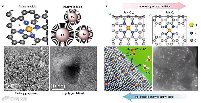 尽管Fe-N-C催化剂取得了非常好的进展,但该催化剂在酸性条件下Fe的溶解会引起芬顿效应,对质子交换膜和固体电解质产生很大的破坏,造成电池性能下降甚至电池失效。因而进年来研究工作者研发了钴基及锰基非贵金属催化剂,但其初始性能目前还远未达到实际应用的要求。非铂催化剂的稳定性问题仍是一大挑战,这与活性中心结构及碳基体特性相关。由于碳是非铂催化剂中的主要组成部分,具有石墨化结构的碳基体能很好的抵抗电化学腐蚀。锰基催化剂Mn-N-C表现出优于Fe-N-C的稳定性,其主要原因可能是MnN4活性中心结构比FeN4更加稳定。但在非铂催化剂中,高石墨化程度与多孔结构以及活性中心的形成是互相矛盾的,需要很好的调控两者的平衡,以获得合适的活性和稳定性。