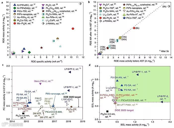 图3给出了近五年性能优异的低铂催化剂在半电池及实际燃料电池测试中的性能对比,充分说明了在提高催化剂性能上取得了非常重要的进展。尤其是具有有序结构的金属间化合物,不但大大减少了贵金属铂的用量,而且其性能得到大幅提高,将成为最有可能替代目前Pt/C的ORR催化剂。
