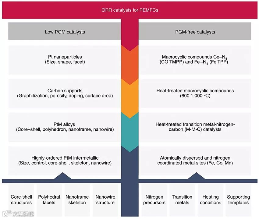 目前,国内外学者主要从两方面来提高催化剂性能并降低催化剂成本:一种是低铂催化剂,另外一种是非铂催化剂(如图1所示),即具有特殊结构和形貌的铂基合金催化剂和完全不含有铂系金属的非铂催化剂。本文主要综述了近五年来这两类催化剂取得的进展,并且对不同催化剂的性能结构给出了深入的讨论,对目前催化剂面临的挑战进行了探讨,并对其发展提出了展望。