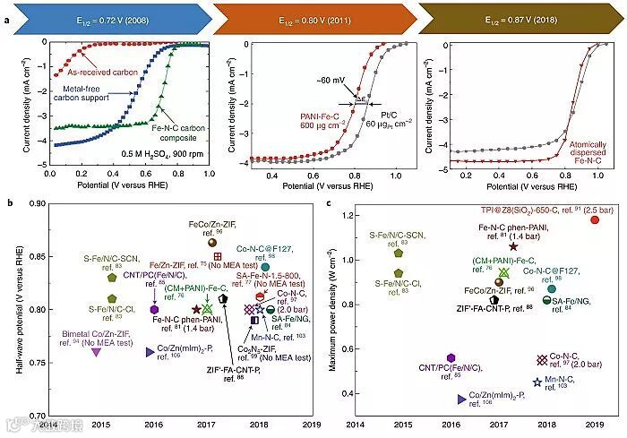 经过近十年研究,以Fe-N-C为代表的非铂催化剂在催化活性上取得了重大进展(图5)。最近,有机金属化合物骨架(MOF)因其特殊的结构,成为制备原子分散的M-N-C催化剂有效前驱体。在MOF中,过渡金属与氮原子以化学键相互作用,热解过程中直接转变成为MNx活性点,通过调控MOF中过渡金属的含量,获得均匀的以原子状态分散的催化剂。这一方法不需要使用非活性的碳载体,由MOF碳化得到的碳结构不但作为活性点的基体,同时保留了MOF中丰富的孔道结构,提高了催化剂的质量传递。由Fe掺杂ZIF-8获得的原子分散Fe-N-C催化剂表现出了很高的催化活性,其半波电位达到0.86 V。在H2-O2燃料电池测试中(1.0 bar),0.87 V时的电流密度达到0.044 A/cm2,与美国能源部的要求只差30 mV。在实际H2-Air燃料电池中(1.0 bar),0.8 V与0.7 V时产生的电流密度分别是120 mA/cm2和380 mA/cm2。最新的报道中,具有凹面结构的Fe-N-C催化剂在H2-Air燃料电池(1.0 bar)0.8 V时产生的电流密度达到0.129 A/cm2。
