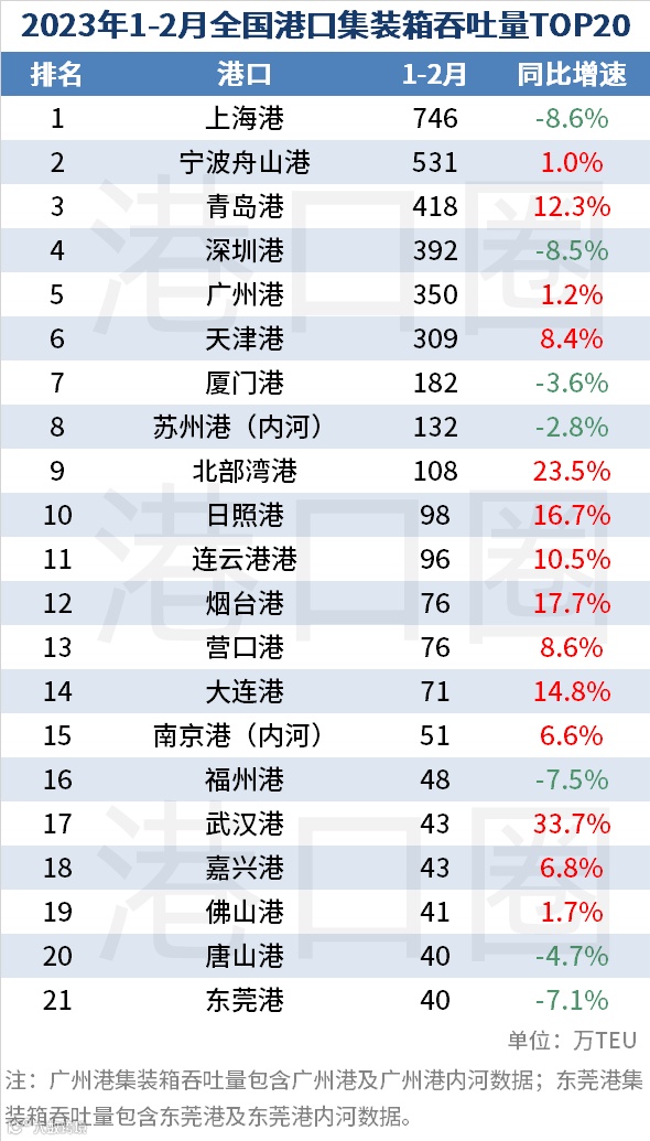 1-2月,全国港口集装箱吞吐量前十名为: