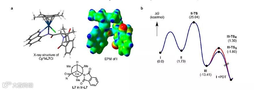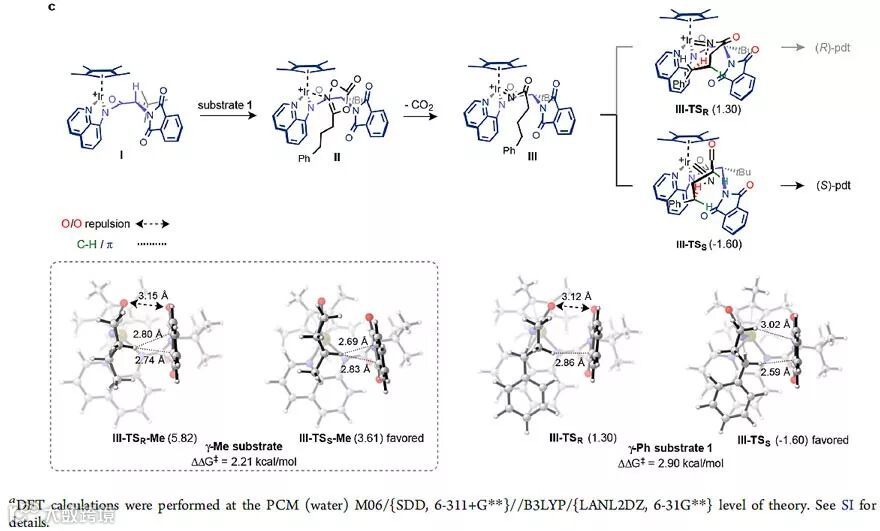 机理研究中,作者成功获得了基于配体L7的催化剂单晶结构(图4a),从单晶结构中可以看出,围绕Ir中心,Cp*、AQ、NPhth三个平面形成一个规则的疏水性空腔,三面包裹结构类似酶的手性口袋。计算结果表明,中间体II形成氮宾III过程为决速步,进而发生C−H插入形成产物。对γ-甲基及γ-苯基底物进一步研究发现,对于产物R构型过渡态,βC−H与NPhth平面存在C−H/π相互作用,但底物羰基O与催化剂NPhth中羰基O有一定的空间排斥作用;在S构型产物的过渡态中,γC−H与NPhth平面存在较强的C−H/π相互作用,这种非共价键相互作用在一定程度上稳定了过渡态的能量。同样在γ-苯基取代底物中也有类似现象。