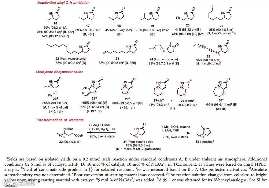 基于最优条件,作者对底物范围进行了考察(图3)。对于活化位点的C−H键,均能取得较好收率及不对称选择性,且官能团容忍性较好;值得注意的是,作者发现对于非活化位点的C−H键,该体系同样具有很好的立体选择性;对于去对称化底物而言,同样可以得到很满意的结果;作者最后完成了γ-内酰胺的转化,以非常高的效率和选择性合成了Boc保护的γ-氨基酸31及天然产物分子bgugaine(33)。