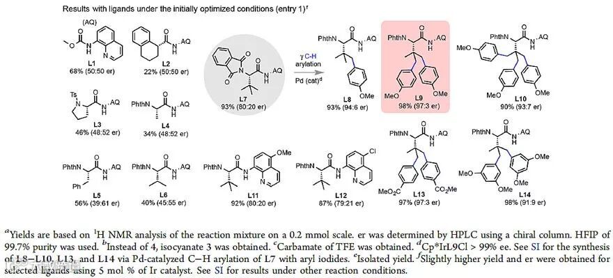 作者首先以4-苯基二噁唑酮为模板底物,对含有8-氨基喹啉的系列配体的进行考察。如图2所示,简单手性酸并不能产生手性诱导(L2);将氨基酸引入到配体中后,只有基于叔亮氨酸的配体可以得到较高的不对称选择性,主要是因为大位阻的叔丁基可以诱导出光学纯的Ir手性中心,从而得到单一构型的Ir(III)金属催化剂,而其它氨基酸配体对应的Ir(III)催化剂为一对非对映异构体(L3-L7)。基于L7,作者对叔丁基进行修饰,利用Pd催化AQ导向的C(sp3)−H键芳基化合成了L8-L10,发现芳基化的配体可以提高反应的立体选择性,其中双芳基化配体(L9)可以给出最好结果(99:1 er)。AQ上不同取代基对不对称选择性影响并不大(L11-L12)。其他条件考察中,值得注意的几点有:(1)HFIP作为溶剂极大抑制了重排产物异氰酸酯的生成(Entry 1 vs. Entry 6);(2) 催化剂的量增加,收率及不对称选择性有所增加(Entry 3-4);(3)HFIP/H2O作为混合溶剂对立体选择性影响很大(Entry 1、Entry 10-14);(4)温度降低有利于不对称选择性(Entry 17-18);(5)配体L9、HFIP/H2O、室温下可得到最优结果(Entry 20)。