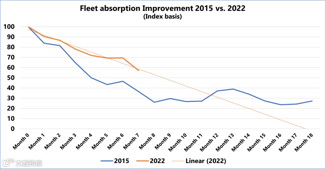 第三种方法,如图所示,根据Sea-Intelligence首席执行官的说法,是将2015年和2022年的发展正常化到相同的基线,并在各自的峰值处创建一个相当于100点的吸收指数。