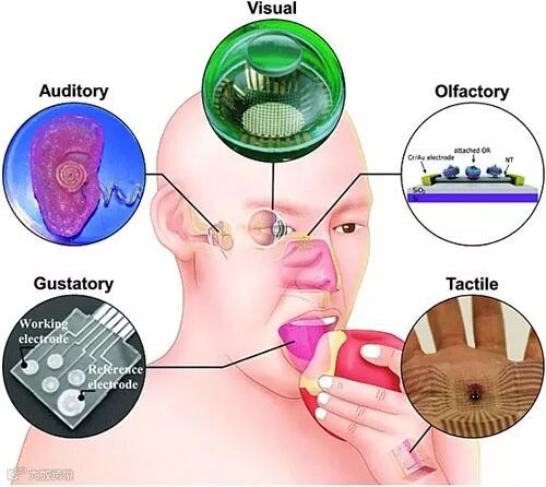人类通过五种感觉(视觉、听觉、嗅觉、味觉和触觉)和四种受体(化学受体、光受体、机械受体和热受体)感知世界。比如,鼻子和舌头,通过化学受体提供嗅觉和味觉;眼睛通过光受体接收视觉信息;皮肤通过高灵敏度的机械受体产生触觉,而最敏感的机械感受器存在于内耳毛细胞中,它负责声音的传导;真皮和器官利用热受体,检测寒冷和温暖。此外,一些生物物种通过不寻常的感觉(如湿度和磁场)感知世界,甚至有科学家认为,人类的“第六感”与磁场存在着潜在的联系 [1]。仿生电子学,通过模拟人类的感知器官和原理,成为我们的“新五官”。