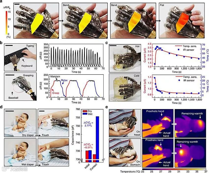 电子皮肤是最近柔性和可伸缩器件研究中的热门话题,我们也不止一次报道过关于电子皮肤的科研进展(点击阅读相关:进展一、进展二)。研究者们从应力的感知、应变的判断、温度传感、柔性伸缩可穿戴、透气透水性能等各个角度模拟人类的皮肤,甚至将各种传感器集成化,制备了“智能假肢手”,同时实现各种功能。