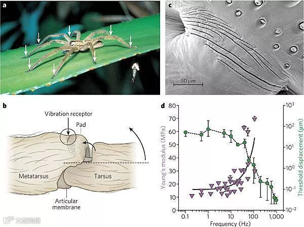 与人类相比,动物的对振动的感知更为敏感。比如蜘蛛,便是最敏感的生物物种之一,为了捕捉猎物,可以觉察到由昆虫引起的蜘蛛网上微小的振动,这得益于其髋关节特殊的裂缝结构。有研究者受此启发,研发出高灵敏度的振动传感器,可以检测到振幅仅为10纳米的微小振动。
