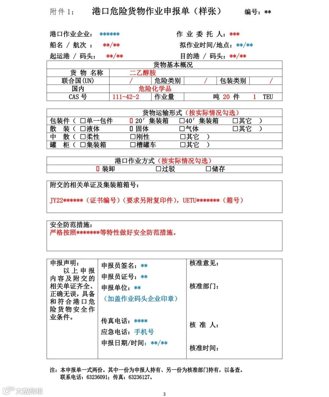 二、自2022年7月1日00时起,船公司及代理须于船舶到港前24小时,以邮件方式向作业码头提供具有资质的第三方机构出具的待作业危化品集装箱的危险特性分类鉴定报告,以及填写规范完整的港口危险货物作业申报单(详见:“附件1”,红色部分为需要填写的内容)。