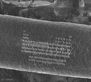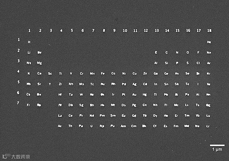 既然有最大的周期表,自然也会有最小的。今年早些时候,英国诺丁汉大学的研究人员利用电子束光刻蚀技术在硅片上刻上了迄今为止最小的元素周期表:面积仅14 μm × 7 μm,线条宽度30 nm,与病毒大小相仿。它的面积仅是穆尔西亚大学超大元素周期表的万亿分之一。这几位诺丁汉大学研究人员似乎对创造超小周期表情有独钟,上一个世界纪录同样出自他们的手底。那次作品刻在了著名化学家Martyn Poliakoff的一根头发上。酷~