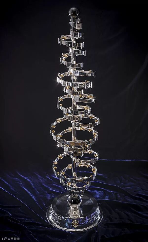 剑桥大学制作的这座元素周期表真是“富贵逼人”。它由手艺精湛的银匠师傅精心制作。它的主体部分和大部分代表元素的小方块由纯银打造,银不够值钱?金、铂、钯的三个小方块由它们自己制成,纯金就算了,那么大一块铂和钯得多少钱啊?但这些还不是最厉害的,碳元素的小方块上竟然镶钻了!不过也没毛病,钻石就是碳单质嘛。除了用料考究,这座元素周期表的构造也很特别,它不是常见的矩形或门捷列夫式周期表,而是1920年由Georges Schaltenbrand设计的螺旋式元素周期表,不同直径的螺旋代表s、p、d和f轨道。
