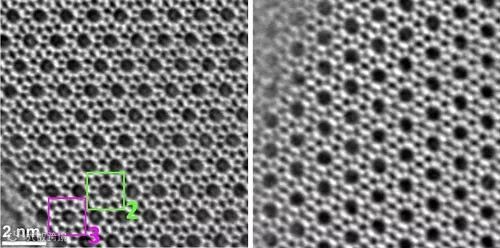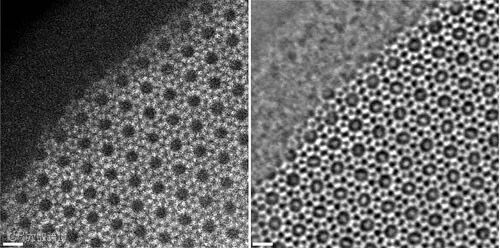图1. 吸附了VOC的Silicalite-1分子筛:(左) HAADF-STEM 图像;(右)iDPC-STEM图像。