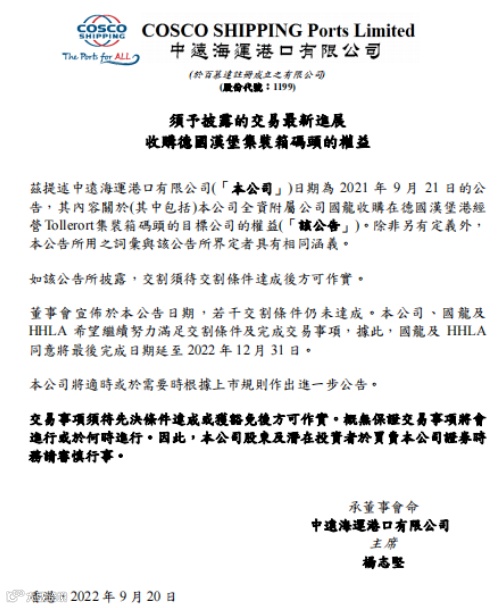 9月20日,中远海运港口发布公告,披露有关收购汉堡集装箱码头的最新进展。公告表示,鉴于交割条件尚未达成,有关各方同意将最后完成日期延至2022年12月31日。