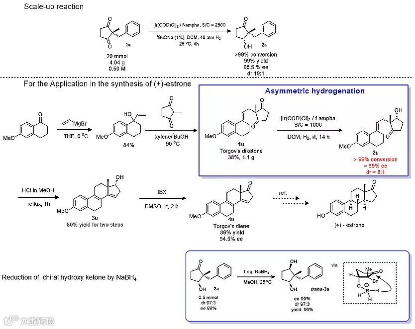 本文所报道的催化体系也做了克级规模实验与应用。将实验规模放大到4克后,也能取得很好的反应结果(99% ee);同时做了(+)-estrone的全合成应用,将Corey所报道的(+)-estrone的全合成路线中构建手性中心的关键步骤进行了替换,即不对称氢化代替CBS还原,并取得了很好的反应结果(99% ee)。最后也对于二酮底物的双还原做了一些尝试,利用硼氢化钠取得了双还原的产物。