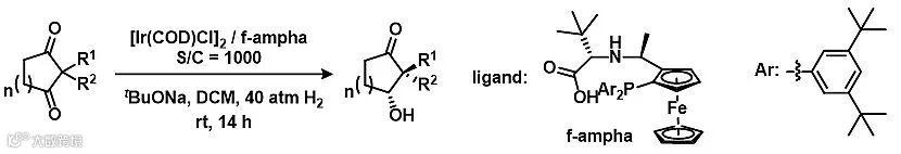 利用张绪穆课题组发展的不对称氢化体系,作者以二茂铁为骨架的手性三齿膦配体与过渡金属铱原位生成的络合物作为催化剂,在碱性条件下,选择性的催化还原环状二酮其中一个羰基,从而一次性构建了两个手性中心,其中包含一个手性季碳中心,并且能取得非常好的结果(99% ee, 24:1 dr, 9500 TON)。