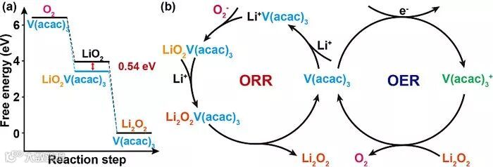 结合理论计算表明,在氧还原过程中,V(acac)3首先结合Li+,生成的Li V(acac)3与超氧化物中间体结合生成LiO2V(acac)3,其再进一步还原生成Li2O2V(acac)3,最终解离生成Li2O2和V(acac)3。在氧析出过程中,V(acac)3会在电极表面氧化,其氧化形式(V(acac)3+)会在较低的电压下催化Li2O2发生分解,自身又被还原成初始状态。因此,V(acac)3缓解了副反应的发生,降低了充电电压,提高了充电效率,增强了电池的循环稳定性。这项工作表明可以设计一种双功能的可溶性催化剂同时解决高DN电解液下的稳定性和提升电池的能量效率。我们期待这种新型的可溶性催化剂将促进高能量密度、长循环稳定性的锂空气电池的实用化。