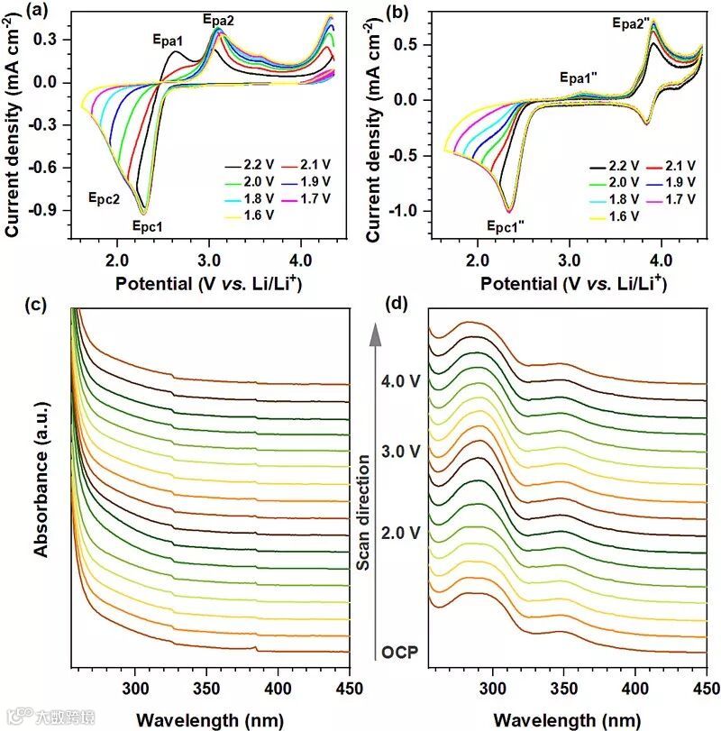 针对上述问题,辽宁大学清洁能源化学研究院科研团队开发出一种具有合理控制Li2O2生成和分解的双功能可溶性催化剂——乙酰丙酮钒(V(acac)3)——系统地解决上述问题。通过电化学和原位紫外光谱测试表明,在高DN的二甲基亚砜(DMSO)电解液体系下,在氧还原过程中,V(acac)3对氧还原中间体有强吸附作用,避免了高活性的氧还原中间体对电极和电解液攻击引发副反应。在氧析出过程中,V(acac)3可以作为氧化还原媒介,促进的Li2O2分解,降低充电电压。V(acac)3可溶性催化剂的使用可以显著提升锂-空气倍率性能,降低充电电压,增强电池的循环稳定性。