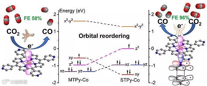 当卟啉分子(MTPyP-Co)催化剂和超薄的单活性位点催化剂(STPyP-Co)都被用于电催化CO2还原时,单活性位点催化剂(STPyP-Co)展现出了更高的活性和选择性(在过电势0.5 V时CO的法拉第效率达到了96%)。结合原位XAS表征和DFT计算发现,单活性位点催化剂(STPyP-Co)由于吡啶的轴向配位,导致了Co活性中心的dz2轨道能级的升高,而dz2轨道能级的升高,有助于电子从Co活性中心向CO2的转移,从而提高CO2还原的选择性和活性。该工作从分子轨道层面探究了异相催化剂化学环境和催化活性之间的关系,为自下而上的设计和构建高效的单原子(single-atom)和单活性位点(single-site)催化剂提供了理论基础和设计思路。