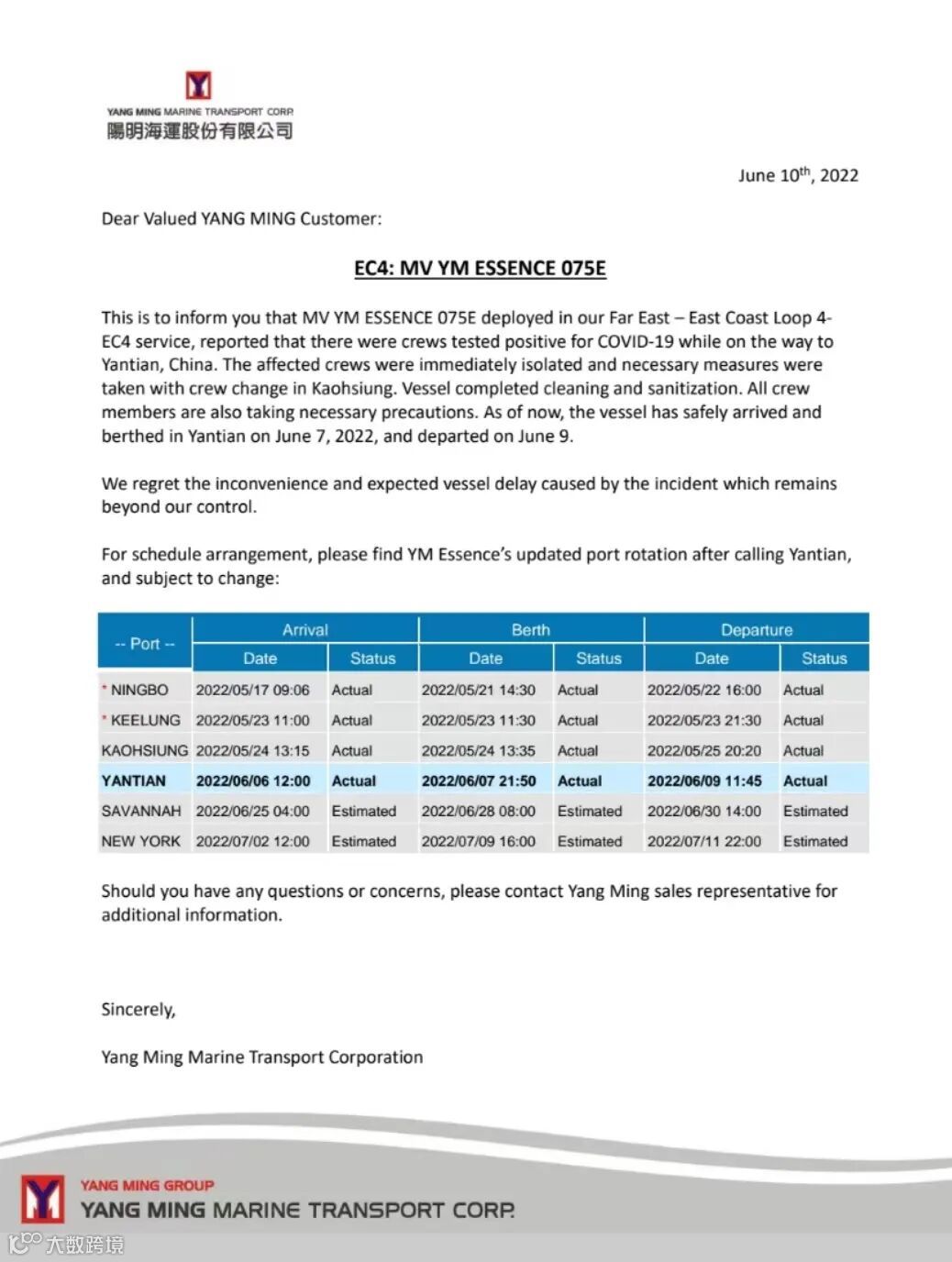 阳明表示,对于此次事故造成的不便和预计船舶的延误深表歉意,目前仍无法控制。船期安排,请查看“YM Essence”在盐田离港后更新的港口轮换,可能会有变化。具体通知如下: